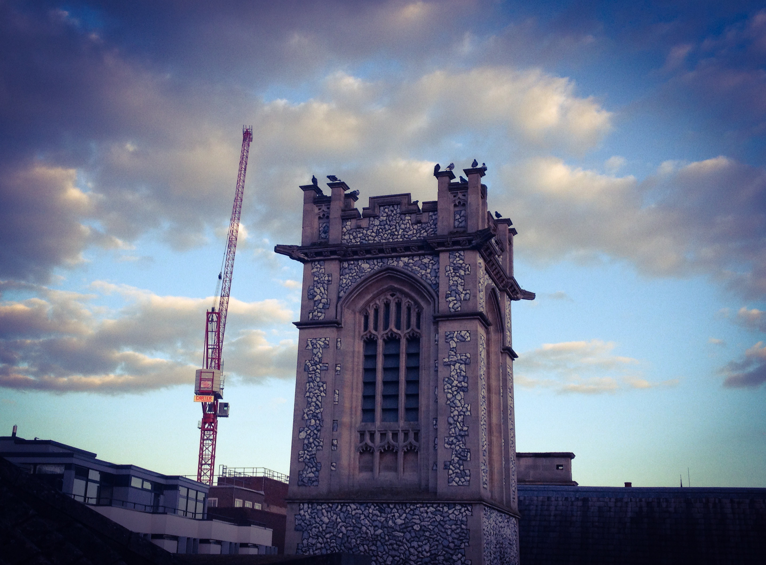 Clouds do their cycle; white fluff to moody grey, disappear and back again. Just like us. Our collective feeling and tone of conversation changes like the weather pattern. The only constant is a crane: stooped in the near distance, bowing down to the hovering  sun/ moon.